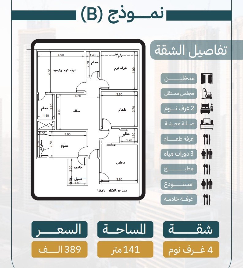 نموذج B : ٤ غرف خلفية مساحتها 141م
