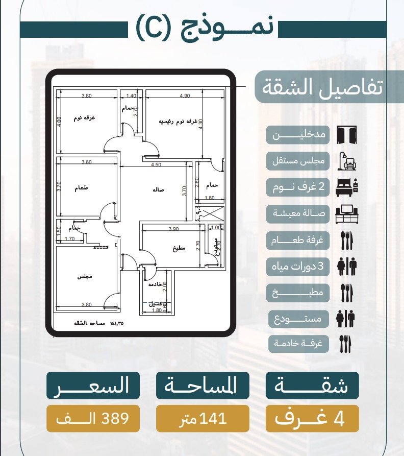 نموذج C : ٤ غرف خلفية مساحتها 141م