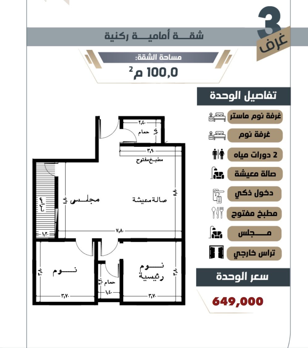 شقة 3 غرف ( ركنية شارعين )